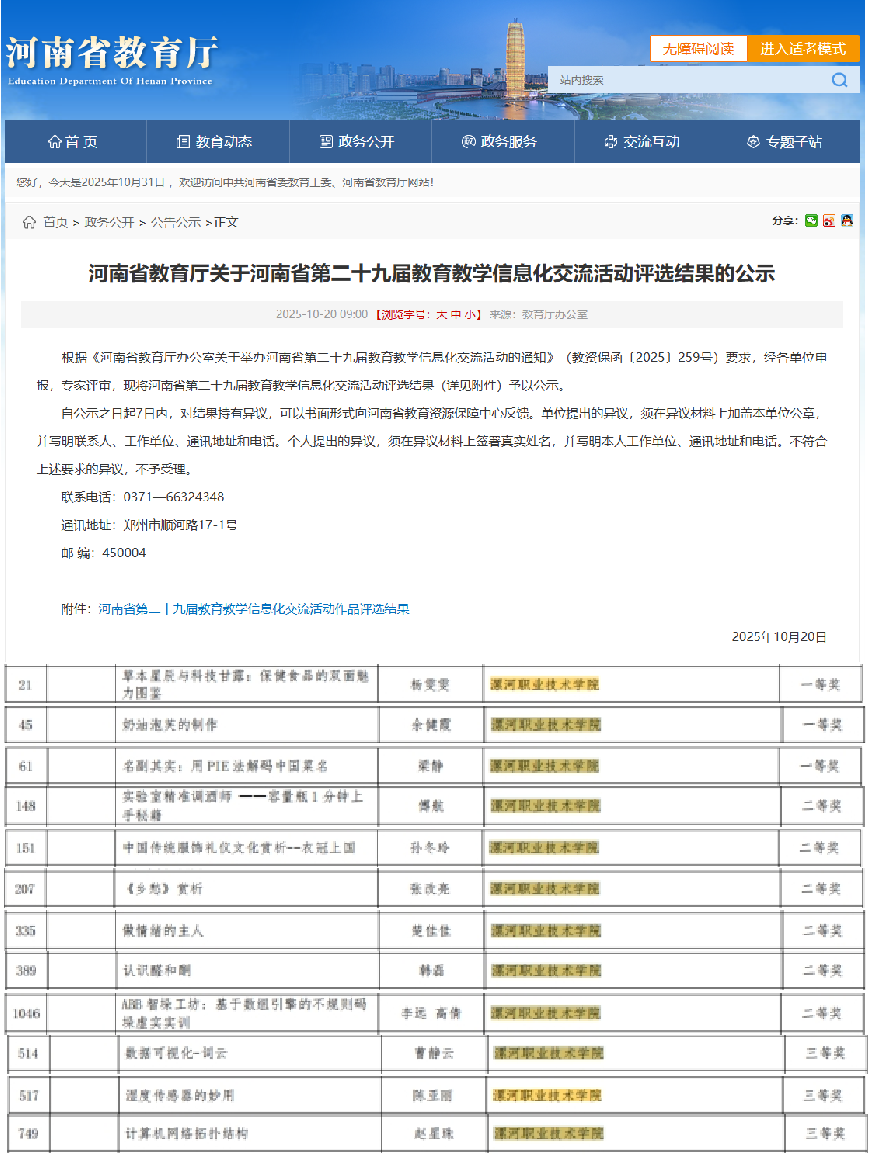 近日,河南省教育厅对第二十九届教育教学信息化交流活动评选结果进行公布,漯河职业技术学院共推荐15件作品参加职业教育组微课、信息化教学课程案例二个类别的比赛,12件作品获奖,其中,3件作品荣获一等奖。